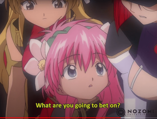 Three of the lovely ladies of the comedy anime series Galaxy Angel are shown together on this oversize pan cel. The cel appears in episode 2. The girls are gambling at a roulette wheel.