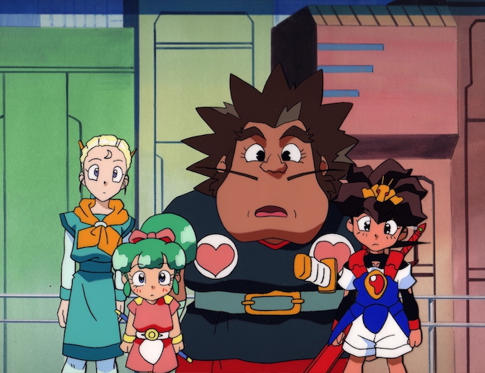 This cel is the perfect introduction to the 1997-8 series Chou-Mashin Eiyuuden Wataru. The core characters in this show are pictured. They include (from left) Sacred Tree (Seijyu), Himiko Shinobibe, Tsurugibe, Shibaraku, and Wataru Ikusabe. In this scene, the group arrives successfully on level five, where they are shown reacting to the new city they discover there.