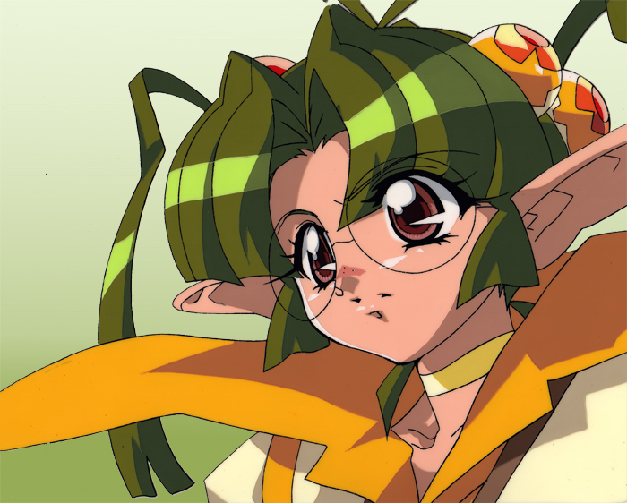 This is Ruka, Noelle’s little sister in the Tenshi ni Narumon assembled family. She is an inventor who is not afraid to occasionally blow things up. Ruka very helpfully tries to invent a device for Noelle to fly so she might become an angel. Like all of the members of the family, she looks out for threats to Noelle which show up regularly. This cel shows up in Step 13, where Ruka sees a suspicious character.
