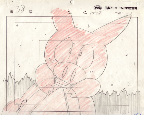 This is a complete cel set with a matching background in vibrant colors. Ton-chan hitched a ride in Karin’s schoolbag all the way back in the first episode, and has clearly made it his space, as this cel is from episode 38.