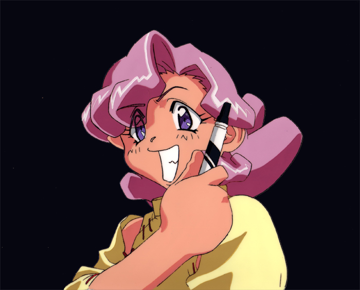 Aun falls for every pretty boy she sees and this time she is looking for a musician named Lamon. To finance her future, she stole the village’s Holy Object that fell from the sky. The cel shows her holding up the sacred item.