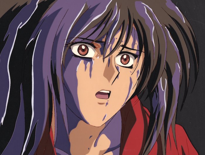 Jun attacks the wolf demon and kills him, after which she returns to her human form, covered in demon gore. However, despite appearances, he somehow revives and turns into an even more horrific monster. The cel above shows Jun’s reaction when he returns.