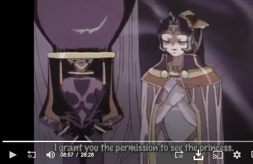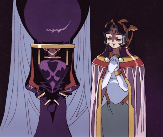 First Imperial Princess Rashara is being romantically pursued by Papacharino. This is the scene in episode 1 where she first enters the story in an appearance at the royal court. She is accompanied by her handmaiden Bulan (left) wearing her strange floating costume. As is often true, the court is full of intrigue, but Rashara has been sheltered and is sweet and trusting.