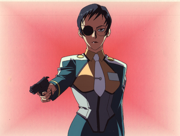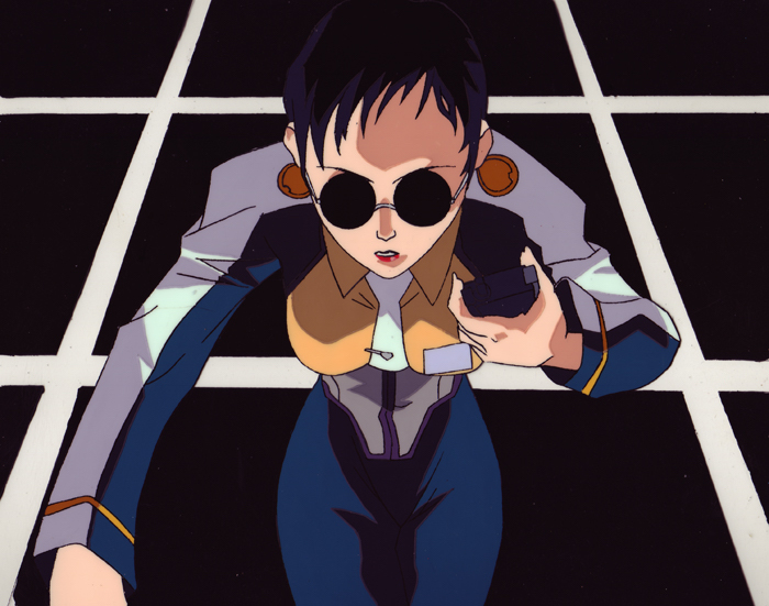 The black lenses of Kaori’s glasses in both of these cels actually have a flashing light effect in the scene.