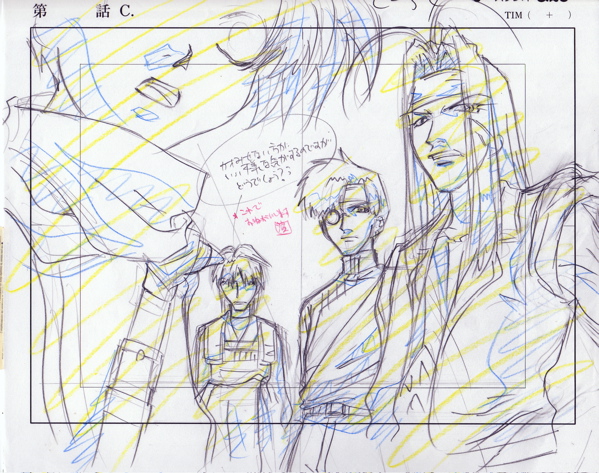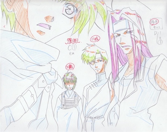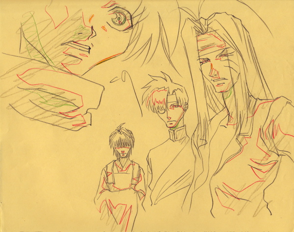 The Sanzo Party Gensomaden Saiyuki: A layout sketch, a rough, and a Douga that includes (from left) Goku, Sanzo (glowering in the back), Hakkai, and Gojyo. Share this: Click to share on X (Opens in new window) X Click to share on Facebook (Opens in new window) Facebook Like Loading...