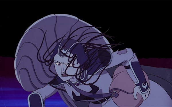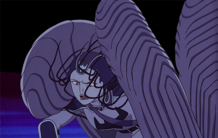 This cel shows up at the beginning of A Tree of Palme. Koram is being attacked by creatures called “bolas” as she runs through the desert. Koram is at various times rational and calm, and at other times she is angry and vengeful with her face distorted by her wrath. Her face in this cel is angry, as she has just battled a group of hunters chasing her.