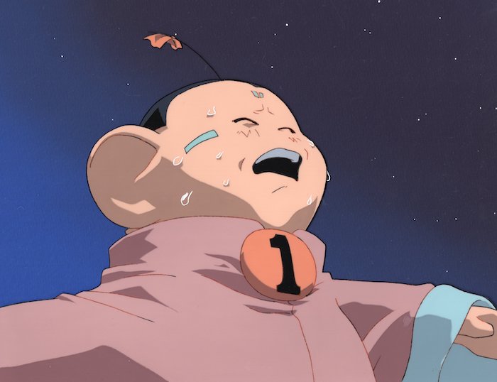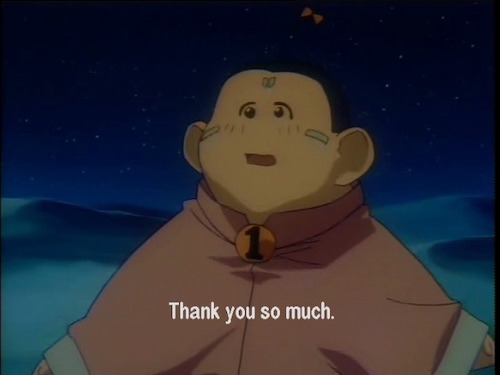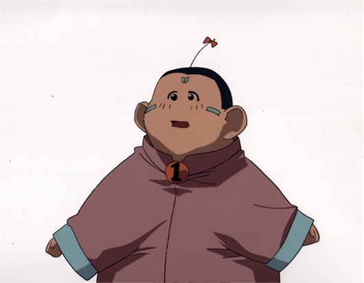 Pochini has been abandoned on the Sandy Planet by that cad Papacharino and is running in fear while being pursued by a large sandworm. Fortunately, a hungry Photon is also in the desert hunting sandworms. The cel below is of her thanking him for saving her.