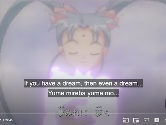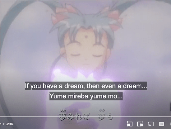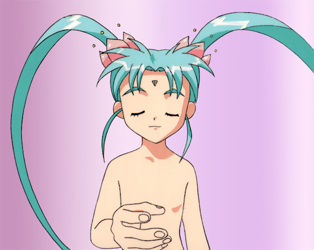 Sasami is in mid-transition into becoming Magical Girl Pretty Sammy in the TV series Magical Project S. Her hand is reaching out to her friend Misao. You don’t actually see her nude in the opening), there are “clothes” made of light over her body. This henshin cel is an extra-special find as it is used in the opening.