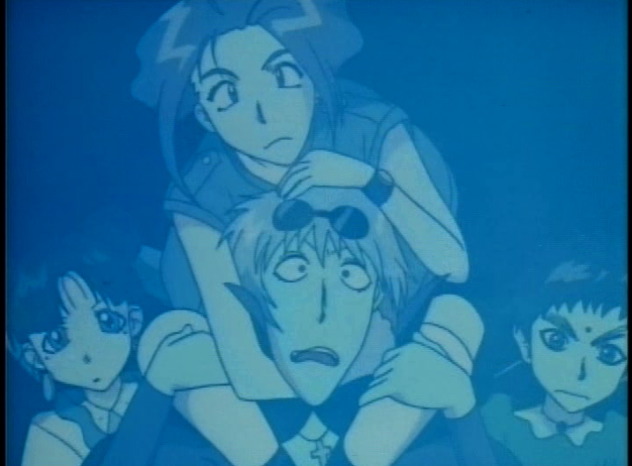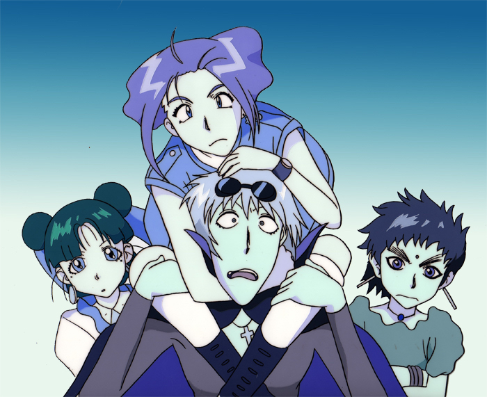 A cel of all the major characters from Master of Mosquiton: From left is Yuki, Inaho holding onto Alucard, and Hono. They are blue because they are traveling inside a supernatural blue light. Their destination is the moon. Possessing the O-part allows the holder and any companions to travel there.