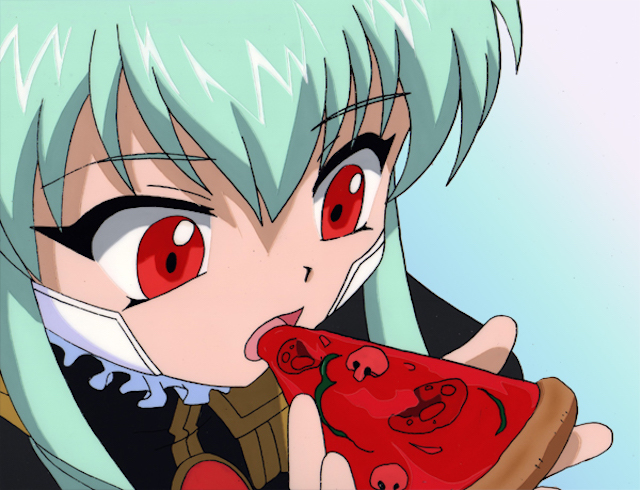 In episode 21 of the Galaxy Angel TV series, Ranpha makes increasingly spicy pizzas. This is her “Spicy Special One Thousand” version. Vanilla is bravely taking a bite.