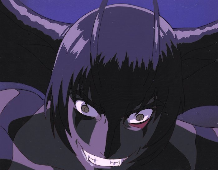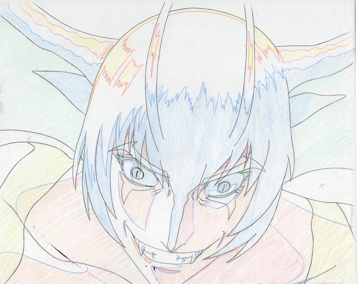 Jun in demon form appears to be about to exit her cel. The backlit head is painted with special emphasis on her gleaming eyes and fangy teeth. The cel is standard size but the Douga is a little oversize. It shows more of her chin. The black lines and spots on the paper are paint left by the cel painter.
