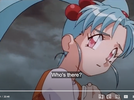 A little later, her mother sends her to deliver a CD nearby, but it is really a trap. Sasami finds an empty lot. She hears scary laughter, and as she turns (the cel above) she meets her nemesis for the first time, Pixy Misa.