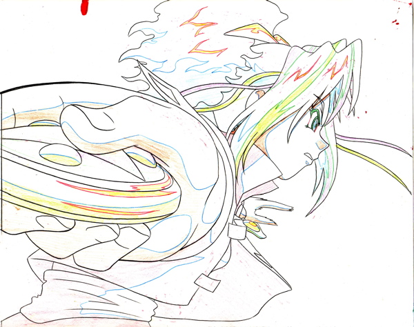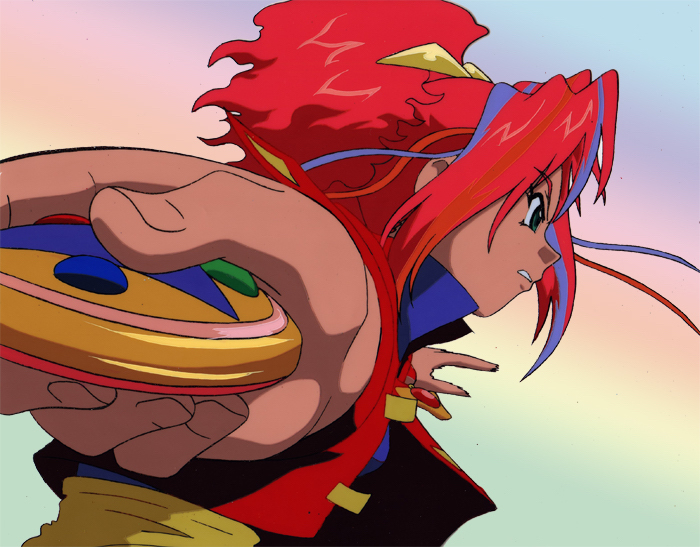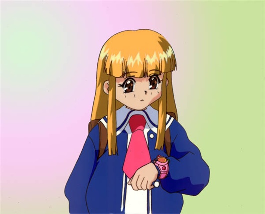 This cel depicts the character Doll Licca from the series Super Doll Licca Chan. Her owner is a 3rd grader Licca Kayama who is the princess of the Doll Kingdom. An evil character named Dr. Scarecrow is after her so he can control the kingdom. To protect her granddaughter, Licca Kayama’s grandmother gives her 3 dolls who are the Doll Knights. They are charged to protect the girl. Each doll is called forth through a bracelet worn by Lica Kamaya See cel below). Doll Licca fights with the use of a magical yo-yo called “Light Spinner” which can be seen in her hand in the cel.