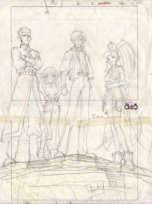 This set consists of a layout drawing and a painted background. Depicted in the sketch are (from the left) the demons Dokugakuji, Lirin, Kougaiji, and Yaone. Dokugakuji is Gojyo’s older full-demon half-brother.