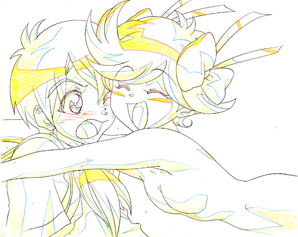 This cut speeds by in a second. Noelle tackles Yuusuke asking him if he is her groom/husband.