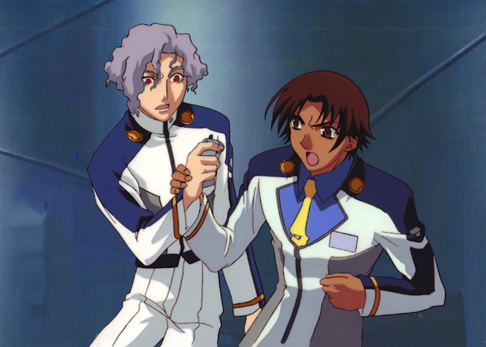 This scene appears early in the series before the pilots start training together. Wolf and Yuu are about to meet the final member of their team, Nell Maqmahausen.