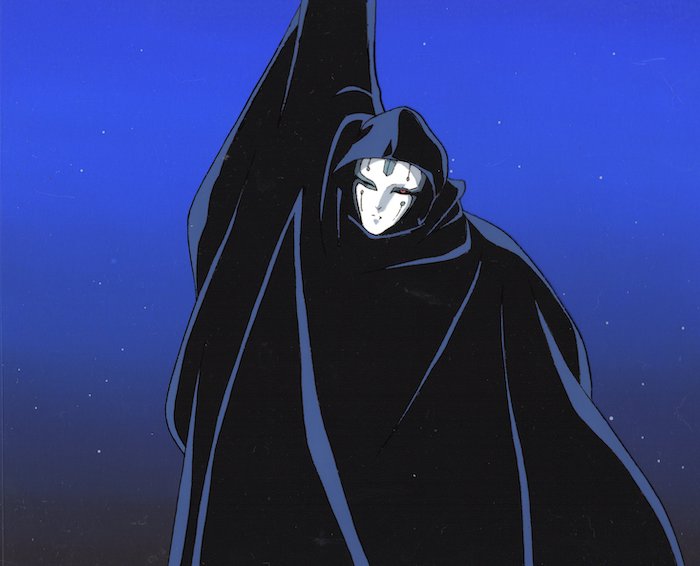 A classic Larva cel. Typically, Larva wears a long black cloak and keeps his face shielded by his mask. He fights alongside Miyu to send the Shinma back into “the Darkness”.
