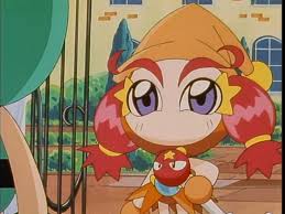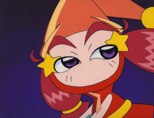 Witchy is a friend of the Green Bomber. She is a wizard-witch. The Green Bomber treats her like a little sister. Based on her pose, in this cel she is likely riding on her broomstick.