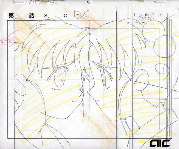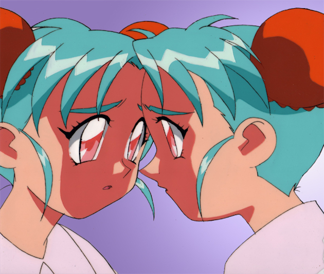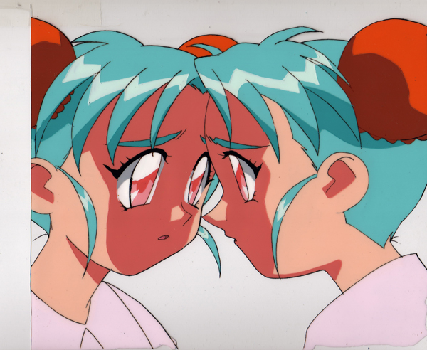 Sasami, dressed for bedtime, is looking at her reflection. There are two cel layers, but the top one is blank. The painted cel was cropped to create a clean line along the left side. The image above shows just the painted cel. The one below includes the second clear layer.