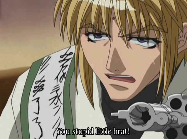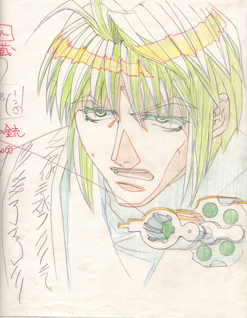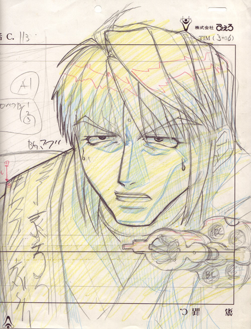 Kinkaku and his brother Ginkaku confront a not-as-dead-as-they-thought Sanzo, who shoots at Ginkaku. The rough for the scene and a screencap are below.