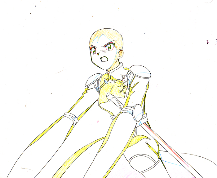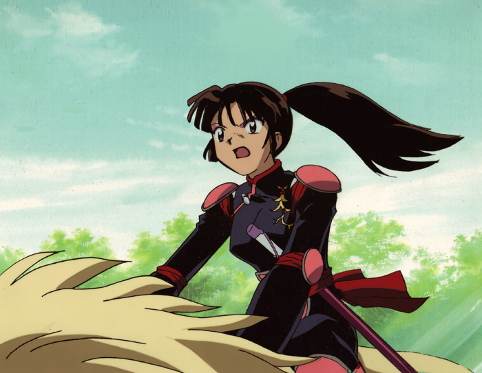 Sango is riding her Nekomata Kirara. The A cel is the figure, and the B cel includes Sango’s hair, fur, and the back of her sash. The douga shows Sangao bald. This cel appears in the episode where Sango joins Inuyasha’s group and fights alongside them for the first time.