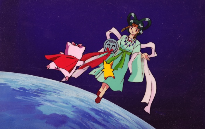 This lovely image appears in episode 13. Buurin and Ton-chan appear to be floating over the Earth as they visit a beautiful goddess holding a disc. The Earth is painted on watercolor paper and sandwiched between two blank cels. The set-up didn’t include a background, So I used another similar-colored background from Tonde Buurin to scan the image. There is some minor fading on the goddess primarily on her left sleeve.