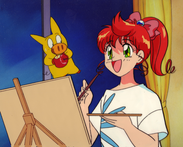 Karin is happily in the throes of creativity as an apple-munching Ton-chan looks on. This cel is very colorful and cute and includes a really adorable layout sketch.