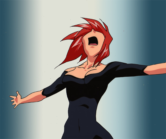 A beam of light comes from the sky. lighting up the figure. Hibari’s body transforms into the body of an adult woman. A tight black suit is added to her body.
