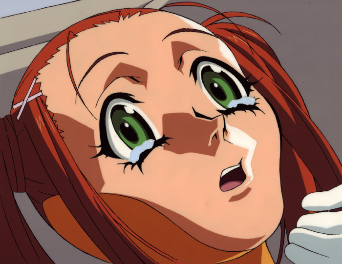 Nanna is in the medical center trying to accept that she saw her father killed in a battle against Verucchio. This cel has two A cels, one is the background cel, and one is most of the face. B is her mouth and Reiko’s comforting hand, and C has her eyes and the tears flowing from them.