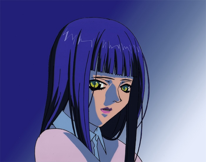 An interesting shade of dark aqua was used on the pupil and the upper rim of the iris in Nell’s eyes to give them the illusion of reflecting light like a cat’s eyes. Nell is a very mysterious character with seemingly superhuman abilities. This cel shows up towards the end of the series when Nell tells Yuu she’ll always be with him, then says goodbye.