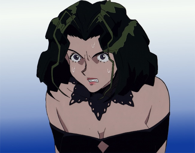 Camille is having a heated argument with Inaho. This cel is unusual because the painted image has been completely cut out and then glued to another clear (numbered) cel page.