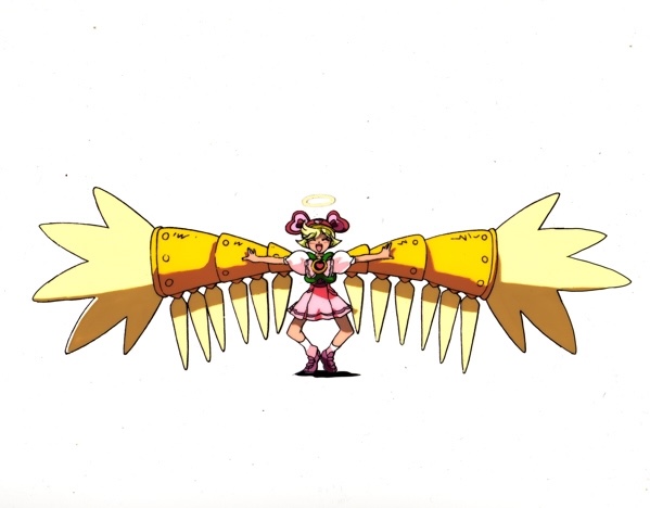 These are quite amazing wings. How can Noelle stand in this contraption? Noelle is preparing to test a new set of wings by attempting to fly from the top of an electrical tower. Another cel of Noelle’s full-length figure and full-width wings is included below.