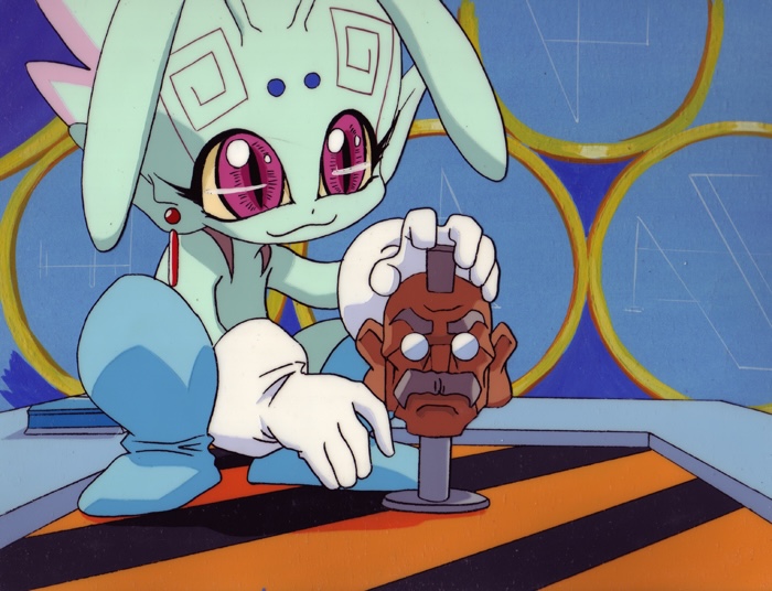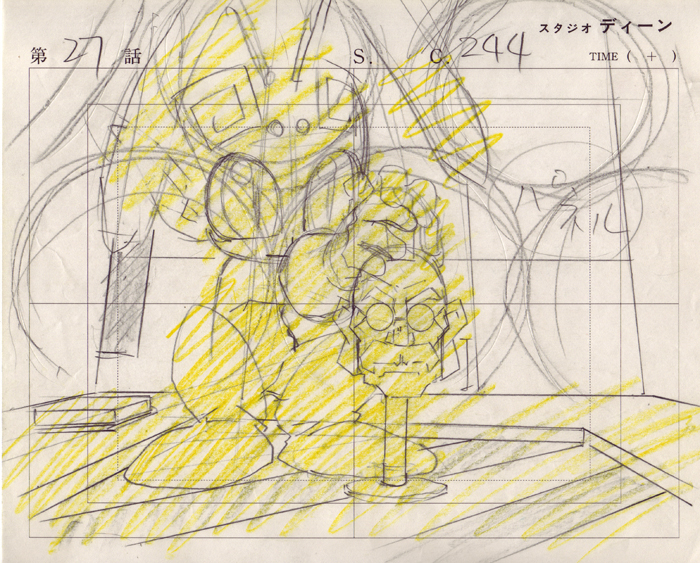 Impy (or Lepri-chan in the Japanese version) is Gluko’s pet. She is playing with a toy that features the head of the team’s boss, Tanaka. The layout sketch is included below.