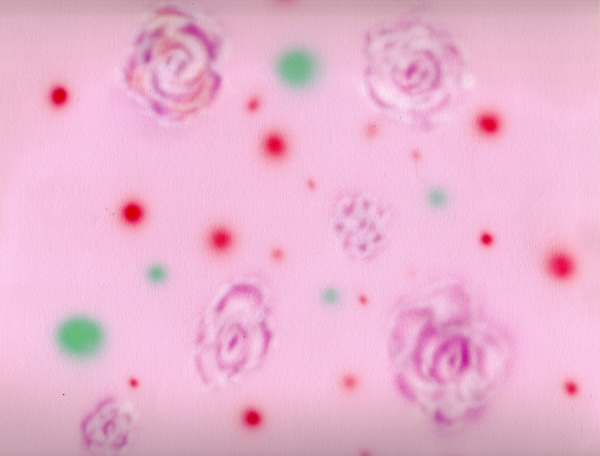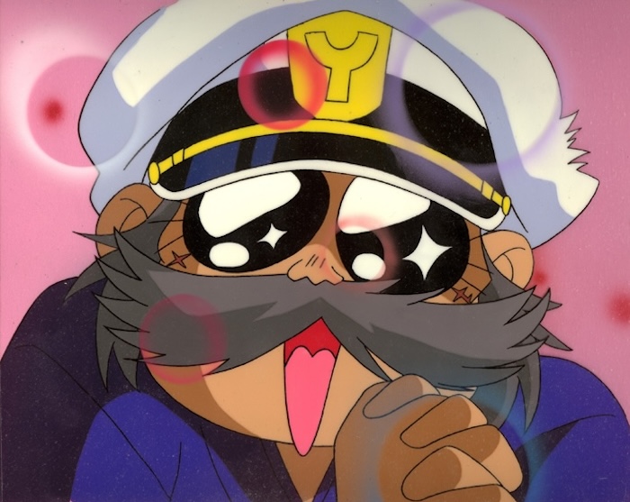 The Captain is excited and sparkly-eyed over something! This cel has 3 unmarked layers of airbrushed bubbles on top of the 3 layers of the figure. The background has airbrushed spots and roses (see below).
