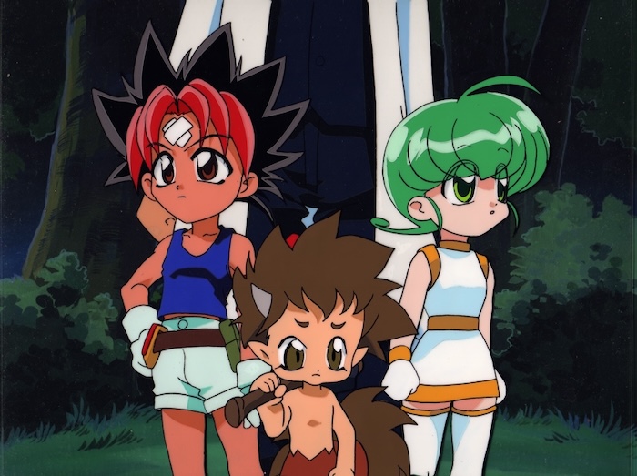Rockna meets Kenta the little centaur boy and grows fond of him, calling him her “little brother.” Mondo becomes jealous. Behind them is the lower half of Professor Hirage.