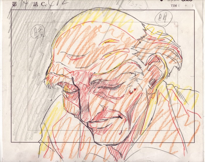 Through most of this scene, Mestro has his eyelids lowered (as shown in the drawing below) but at the end, he opens his eyes and glances toward Ajou who has visited the workshop.