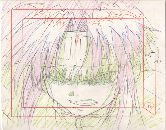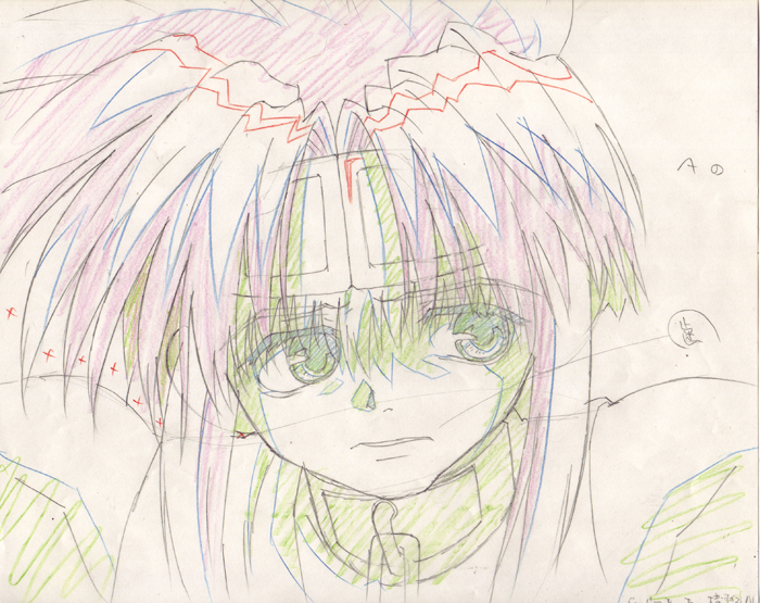 Here are two drawings from a set. This is Goku in a flashback when he was younger. Goku is imprisoned on the summit of Mt. Gogyou because he is so powerful and dangerous. He stayed there for 500 years. The limiter he wears on his brow is designed to reduce his power, otherwise he loses himself and becomes an extremely powerful demon. He is eventually released by Sanzo.