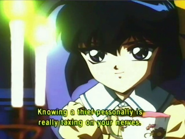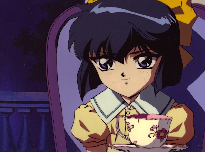 Utako is sitting across from Akira. They are having tea on the balcony at her home. The original scene included a portion of an out-of-focus candelabra with a flame effect in the foreground. Utako and Akira have tea dates every week.