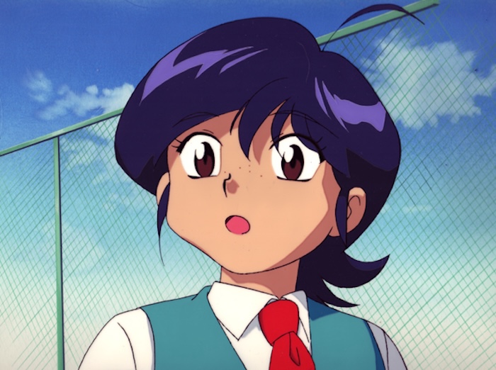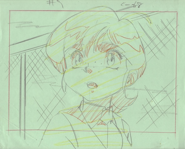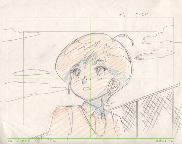 Nozomi is at school on the athletic field. The cel’s set-up includes a mouth and eye layer and 2 sketches.