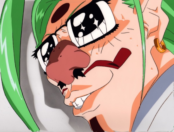 This cel has 2 layers, The bottom layer is the airbrushed shadow. Papacha is spying on the naked girls at the hot springs, which is quite a popular sport in anime.